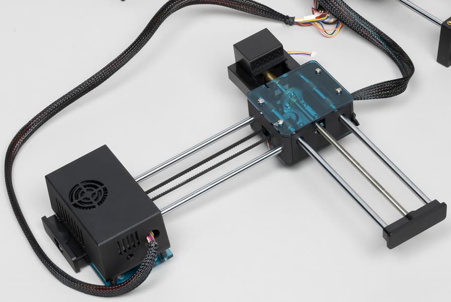 На левом боку основания расположен двигатель и имеются выступы для держателя катушки с нитью, справа можно закрепить блок управления. Заметны концевые датчики — обычные механические «микрики».