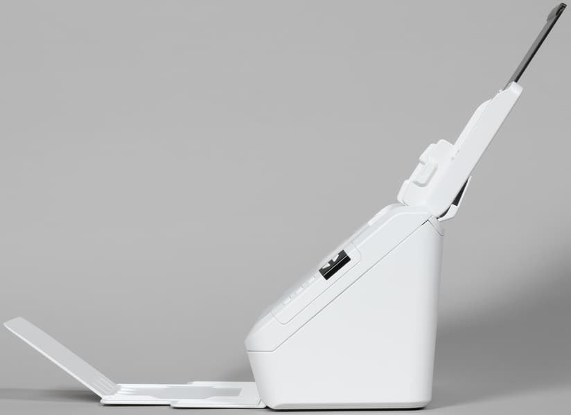 Спереди находится приемный лоток — «раскладушка» из двух ступеней, вторая задействуется в соответствии с размерами обрабатываемых документов и приподнимает передний край выходящих листов. В нерабочем состоянии он складывается и поворачивается вверх, к фронтальной панели сканера. Как и у подавляющего большинства подобных моделей, особой прочностью лоток не отличается, и обращаться с ним нужно осторожно. Кроме того, отсутствуют боковые ограничители, но наши тесты показали, что даже при максимальной скорости стопка выходящих листов получается достаточно ровной.