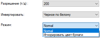 Прочие настройки действительны для обеих сторон. Разрешение устанавливается ступенями от 75 до 600 dpi (но можно добавить и пользовательское значение от 72 до 1200 dpi с шагом в 1 dpi, нажав кнопку с тремя точками справа), предусмотрены возможности инвертировать полученное изображение, отрегулировать яркость и контрастность, а также игнорировать цвет бумаги.