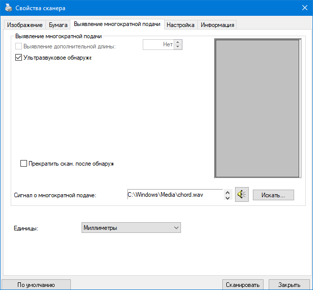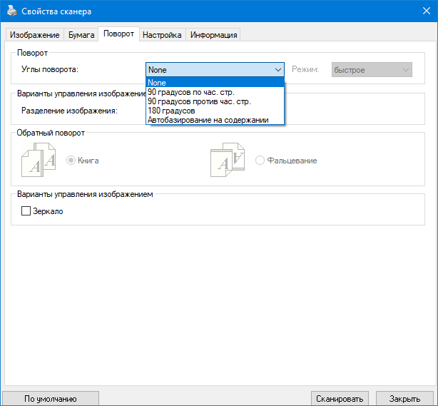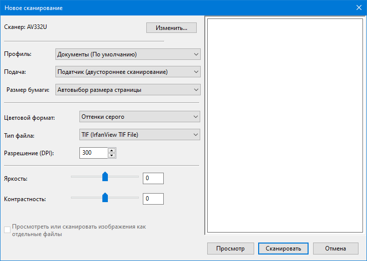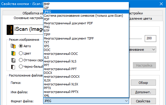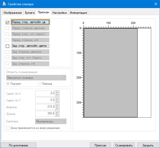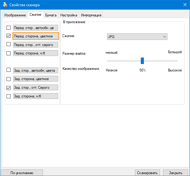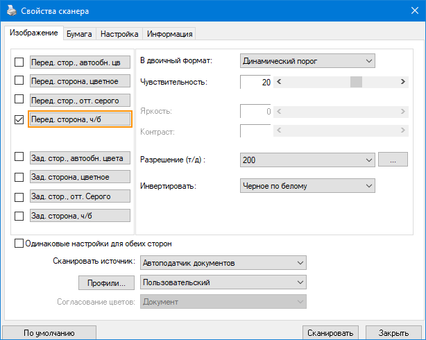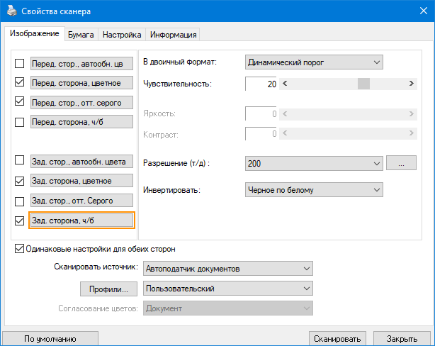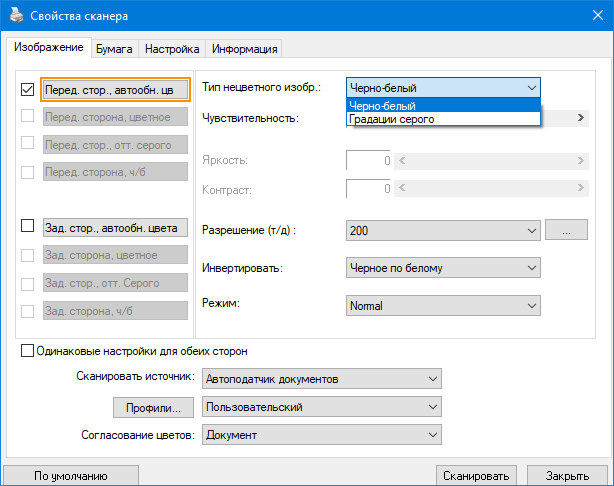 Обратите внимание: как и в TWAIN, нет прямого выбора одно- или двустороннего сканирования, он осуществляется заданием режима цветности для каждой из сторон, причем можно выбрать более одного режима, и тогда для каждой из соответствующих страниц будет два или три скана — например, на скриншоте для передней стороны и цветной, и черно-белый.