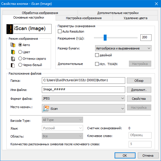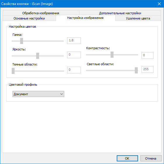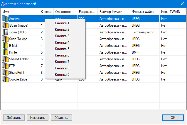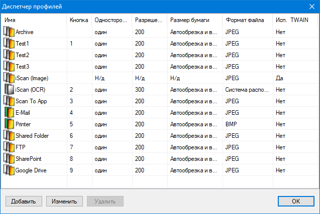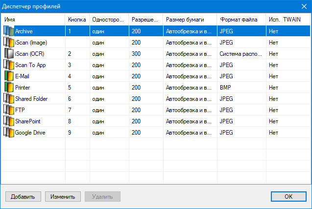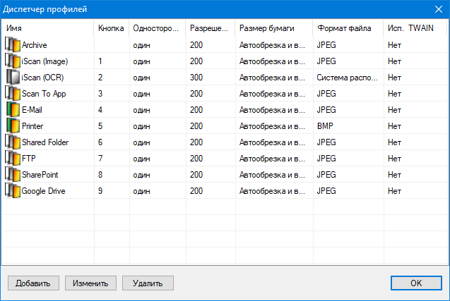 Выбираем строчку с нужной функцией и нажимаем «Изменить» в нижней части окна диспетчера профилей, получаем окно с различными параметрами — и сканирования, и обработки-сохранения полученного изображения.