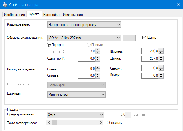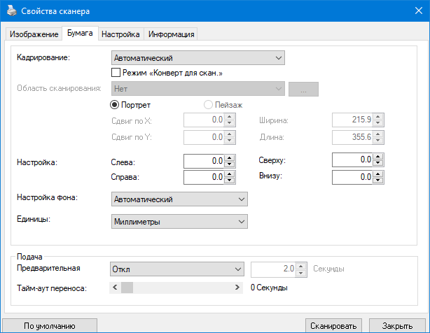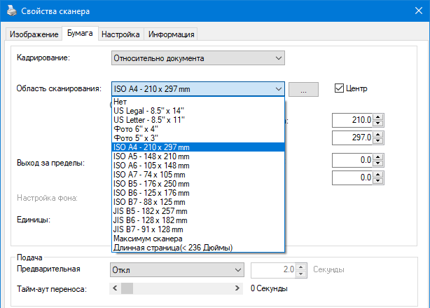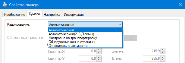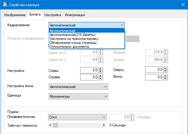 Если использовать установки по умолчанию, то после прохождения примерно трети листа сканирование остановится и будет выдана ошибка «Е4». Поэтому сначала в закладке «Бумага» интерфейса TWAIN надо выбрать правильное значение поля «Кадрирование» — например, «Автоматический(216 Дюймы)».