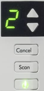 Две верхние кнопки треугольные и поменьше, они встроены в черную накладку, за которой находится индикатор, отображающий цифру, показывающую способ обработки сканов (об этом ниже), который и выбирается этими кнопками. Он же отображает и коды ошибок в виде сменяющих друг друга букв «Е» и цифр. Почему-то в руководстве пользователя индикатор обозначен как «ЖК-экран», хотя в действительности он светодиодный, зеленого свечения.