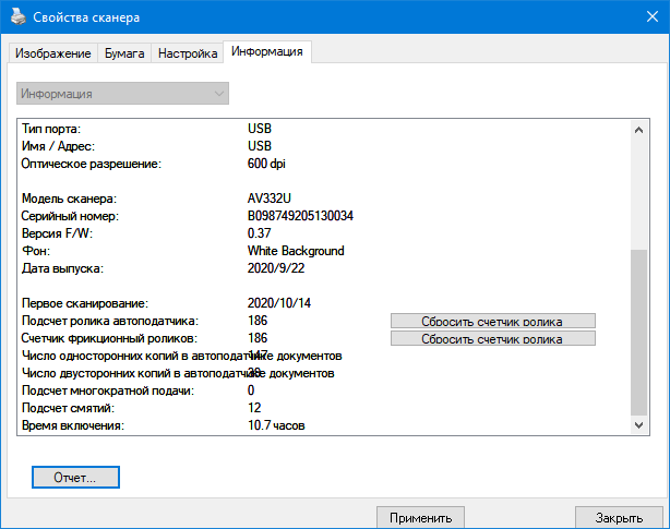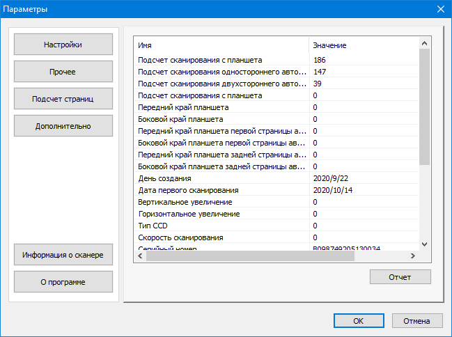 Помимо диспетчера профилей, в меню есть вызов окна с параметрами самой программы Button Manager V2, где можно изменить язык (русский доступен), единицы измерения и т. д. Имеется информация о сканере, включая упоминавшиеся выше счетчики (есть терминологические нестыковки вроде «подсчет сканирования с планшета», но понять все можно), а также раздельные подсчеты сканов, сделанных по каждой кнопке.