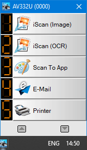 Одновременно отображается лишь пять кнопок, доступ к другим возможен с помощью треугольничков в нижней части этого окна. И это не только чисто информационное окно, клик по любой кнопке в нем запускает соответствующую функцию без использования панели управления сканера.