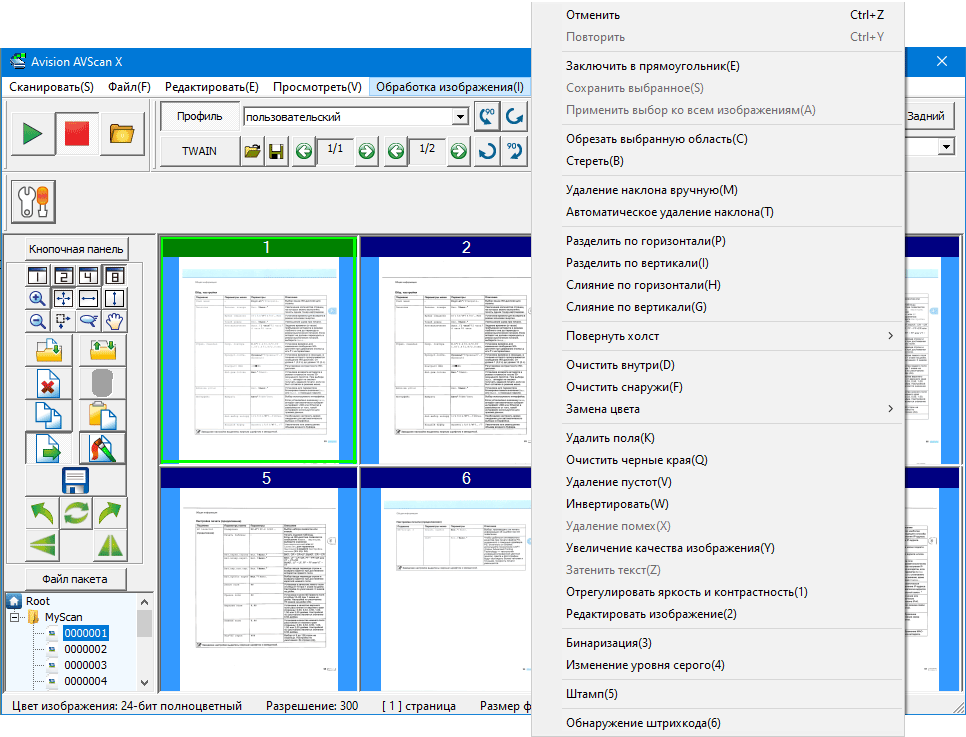 В программе имеются некоторые функции редактирования: с помощью кнопок, сгруппированных в левой панели окна, любое изображение можно повернуть, отобразить по вертикали или горизонтали, удалить, поменять порядок в пакете и добавить в этот пакет страницы с помощью нового сканирования либо импортом какого-то изображения из уже имеющегося файла.