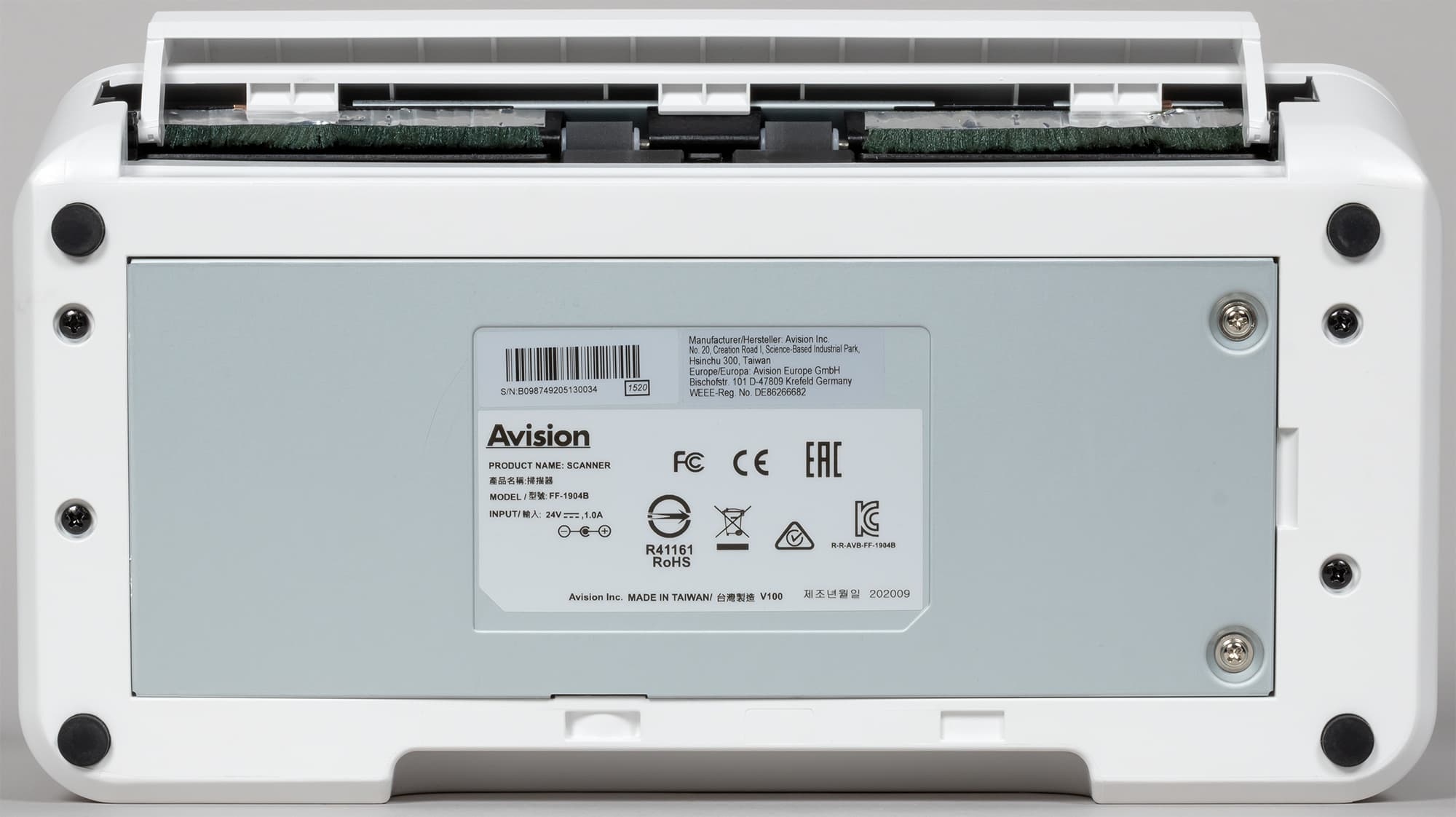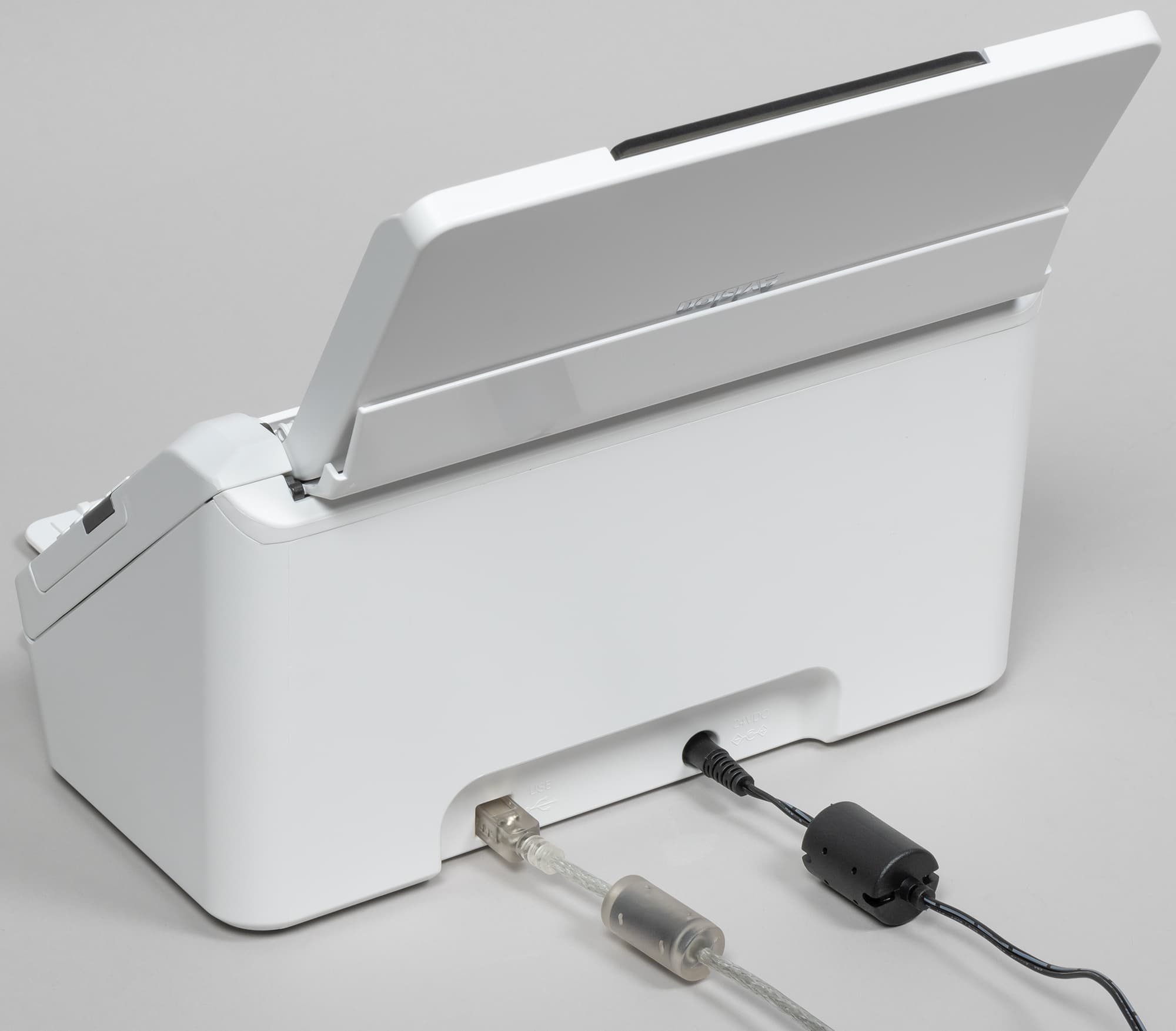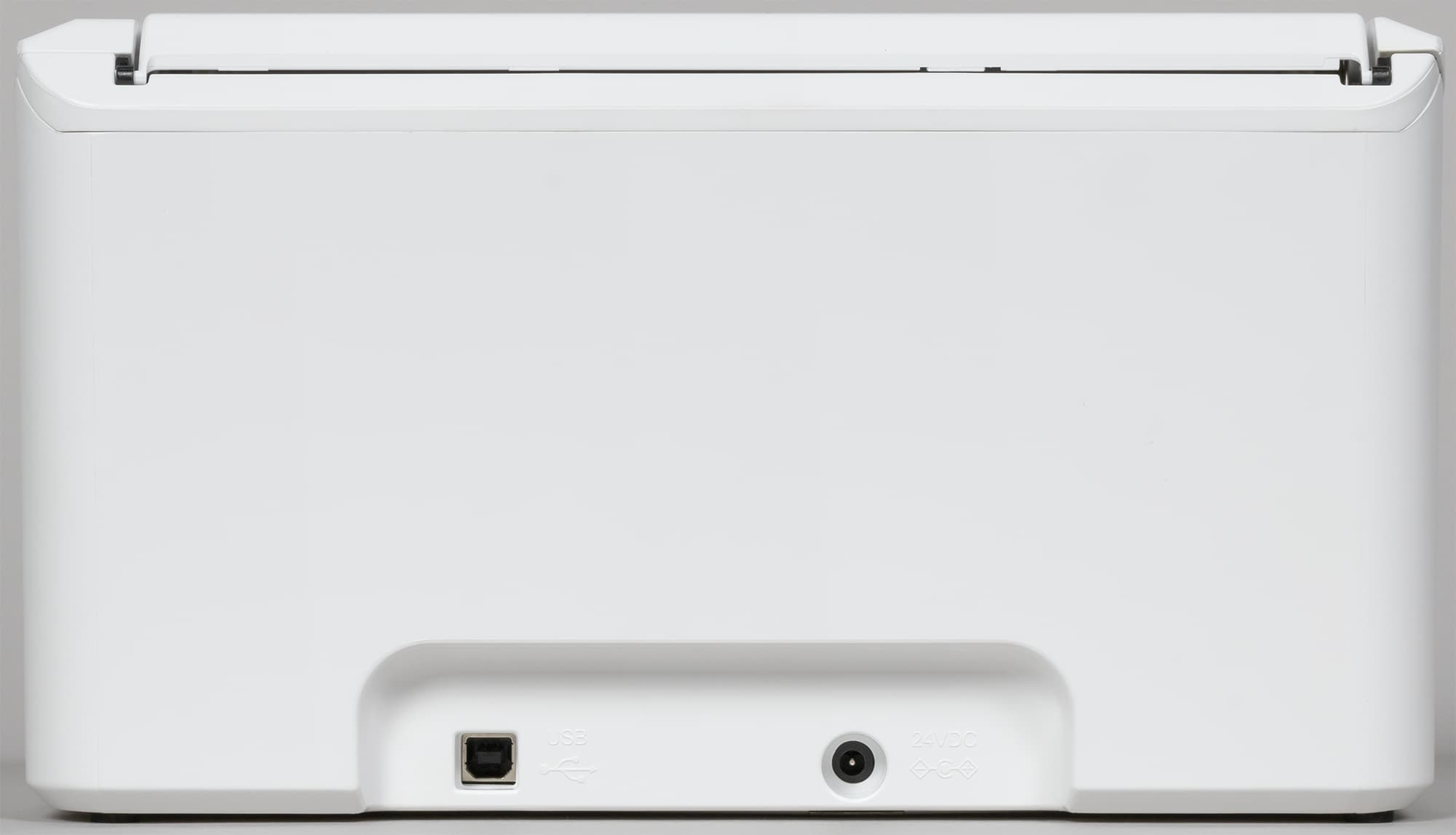 Сзади внизу расположены разъемы питания и USB type B (female) для локального подключения к компьютеру. Они находятся «в тени» подающего лотка, да к тому же заметно утоплены внутрь, а потому подключенные кабели не будут увеличивать площадь, занимаемую сканером.