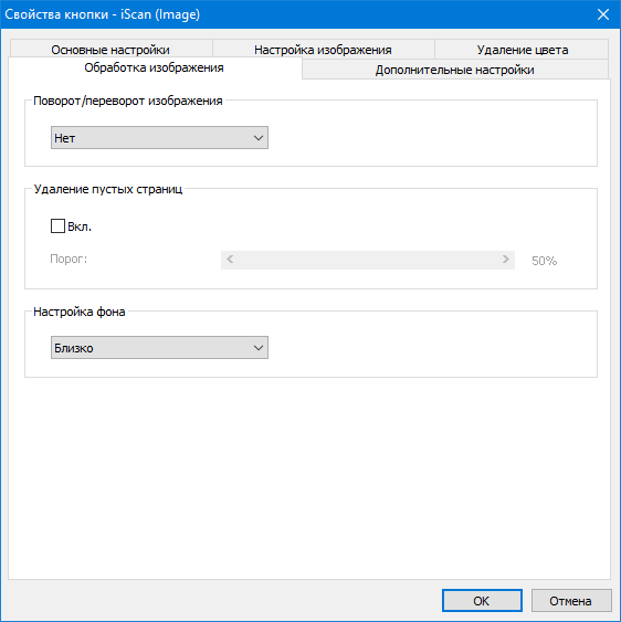 Первая закладка — «Изображение». Здесь нет прямого выбора между одно- и двусторонним режимами, вместо этого имеются раздельные настройки режима цветности для сканирования каждой стороны, при этом отсутствие выбора для задней (верхней) или передней (обращенной к лотку) стороны означает, что «невыбранная» сторона сканироваться не будет. И выбор непременно должен быть сделан хотя бы для одной стороны.
