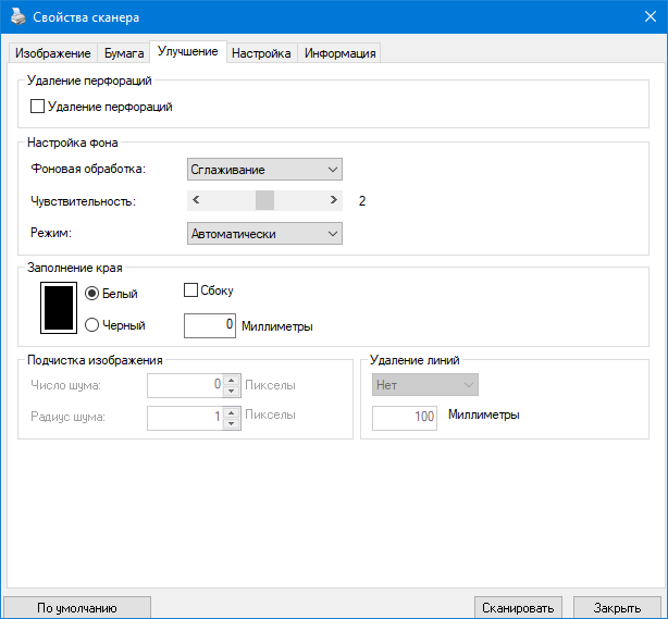 Между некоторыми установками есть зависимость: так, яркость и контрастность регулируются не при любых настройках, что видно на приведенных выше скриншотах, а цвет бумаги можно удалять лишь в режиме автообнаружения цвета, при всех остальных вариантах цветности эта функция не будет доступной.