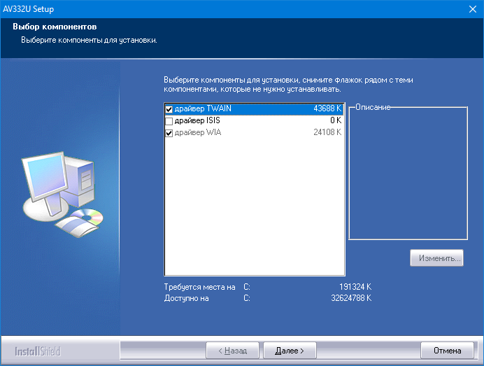 В соответствии с имеющейся вверху подсказкой, начинаем с драйверов. WIA устанавливается по умолчанию, TWAIN и ISIS — по желанию; поскольку программ, поддерживающих ISIS, у нас нет, выбираем только TWAIN.