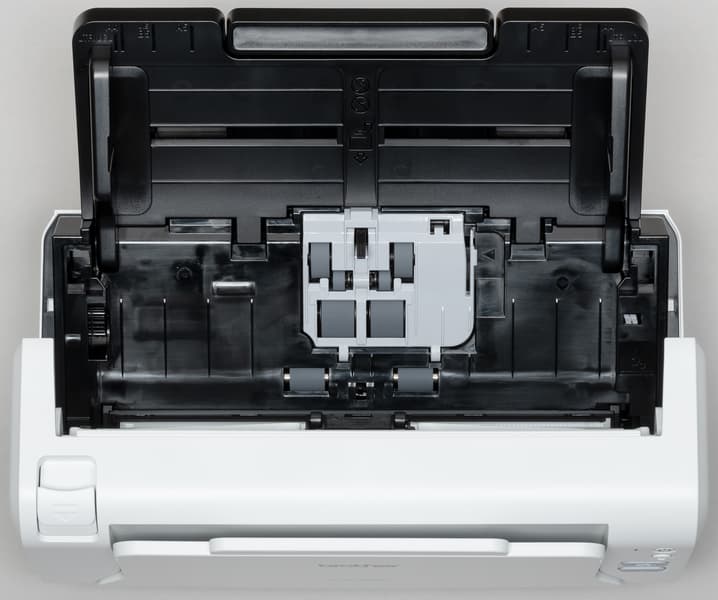 Слева в верхней части корпуса имеется рычажок, нажатие на который позволяет откинуть фронтальную часть сканера, после чего открывается доступ к сканирующим линейкам, подающим роликам и другим компонентам. Это нужно для периодического обслуживания: после прохождения через сканер многих тысяч документов внутри неизбежно будет накапливаться бумажная пыль, ухудшающая качество сканирования, да и поверхности роликов будут загрязняться, что может вызвать сбои в подаче.
