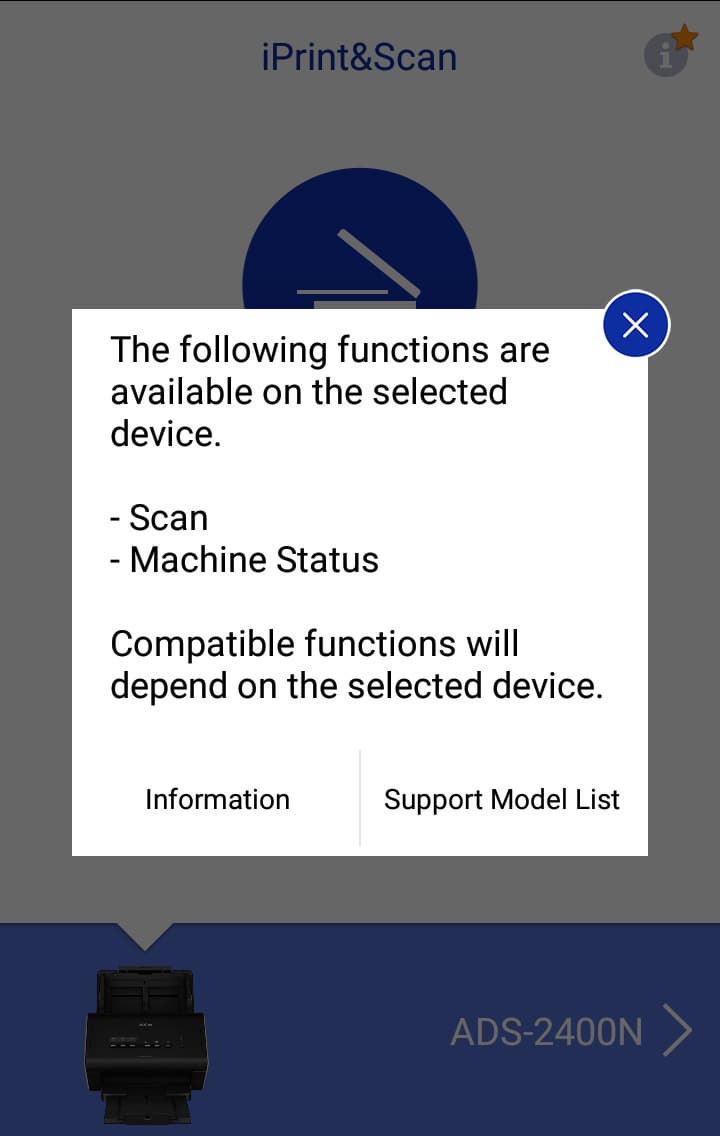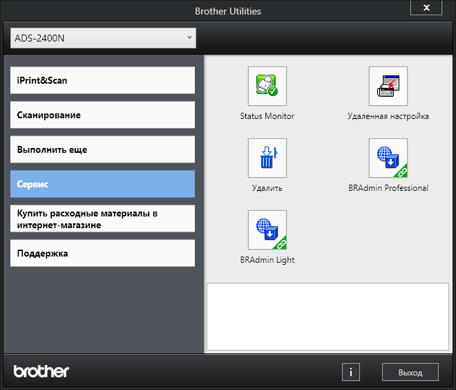 Выбираем нужное (если устройств Brother в сети несколько), далее открывается рабочее окно приложения с уточнением, что именно можно будет делать — в нашем случае сканировать и проверять состояние.