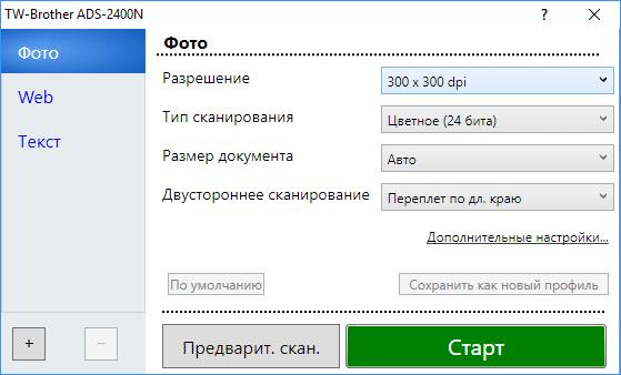 Клик по любой из иконок выводит окно с настройками, похожее на уже виденное нами. Отличия в более широком списке установок и в наличии кнопки запуска сканирования. Смысл режима в том, что окно ControlCenter уже не используется как промежуточный этап, сканы сразу будут передаваться в нужное приложение или сохраняться в папку.