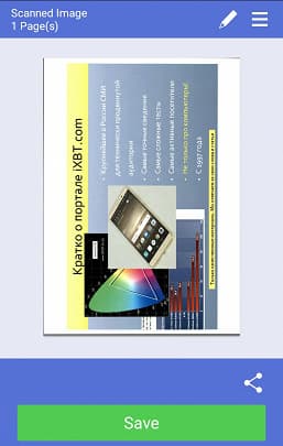 Значок в виде уголка над кнопкой Save позволяет «поделиться» (share) сканами в формате JPEG или PDF с каким-то из имеющихся на гаджете приложений — например, открыть для последующей обработки.