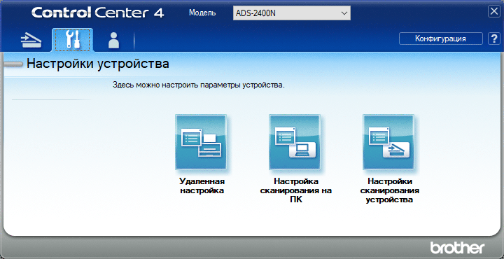 Из окна Brother Utilities можно задействовать приложение ControlCenter4, которое может запускаться по требованию или, как Status Monitor, включаться в автозагрузку. Оно позволит работать с документами без какого-либо дополнительного ПО, а также осуществлять настройки сканера через вызов только что упомянутой программы Brother ADS.