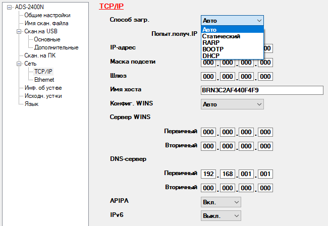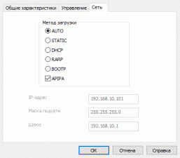 Сначала с помощью ControlCenter следует выбрать установки, соответствующие реалиям вашей локальной сети. Так, способ получения IP-адреса по умолчанию имеет установку «Авто», что означает использование одного из протоколов DHCP, BOOTP, RARP при наличии какого-то из них. Но можно указать и конкретный протокол, а также вручную задать статический адрес.
