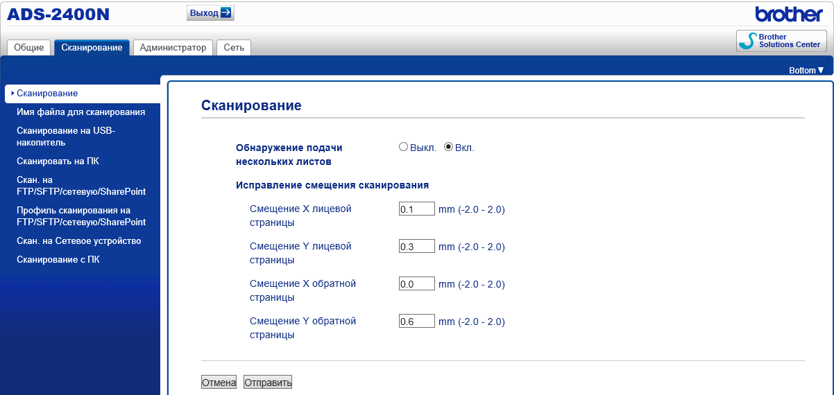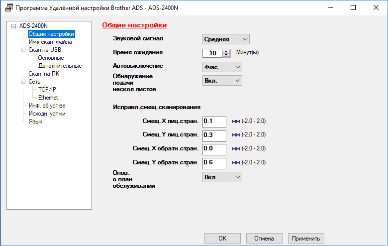 Простейшая панель управления модели ADS-2400N не позволяет производить какие-то оперативные настройки, поэтому это приходится делать заранее с компьютера, используя приложение ControlCenter. Перечень установок длинный, да еще и с зависимостями одних параметров от других, поэтому заниматься перечислением не будем, а просто приведем два скриншота, дающие представление о возможностях.