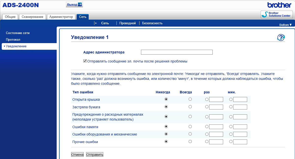 В последней закладке находятся сетевые настройки, включая и рассылку уведомлений о событиях.
