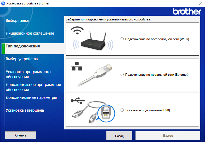 Начало установки вполне привычное: выбор языка (доступен и русский), ознакомление с лицензионным соглашением, уточнение способа подключения — пока мы выбираем «локальное USB».
