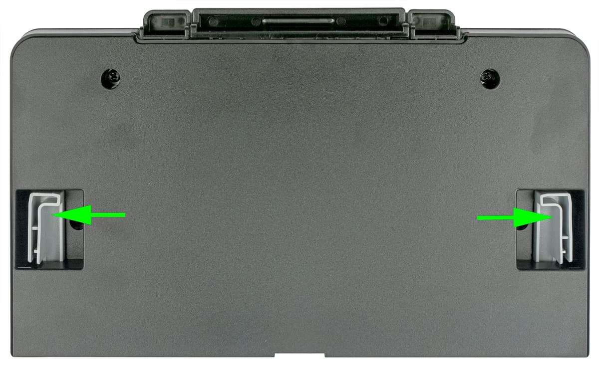 Крепится он с помощью боковых защелок, доступных сзади. Для снятия лотка их нужно оттянуть к краям (на фото показано стрелками).