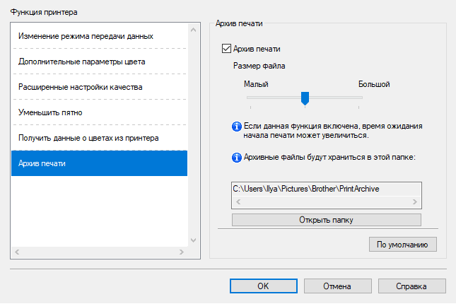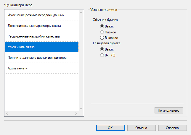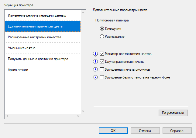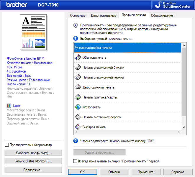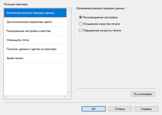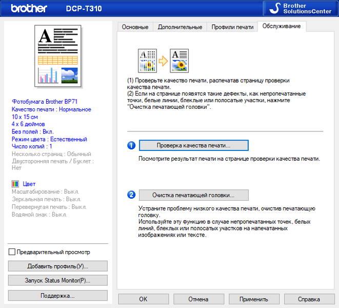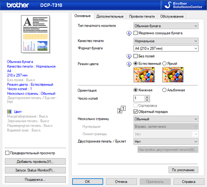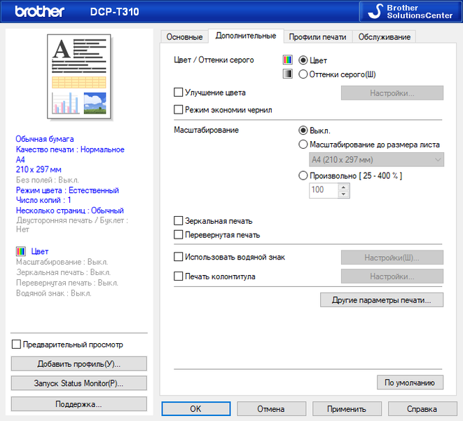 - (G) печать тиража с качеством «быстрое», тихий режим.