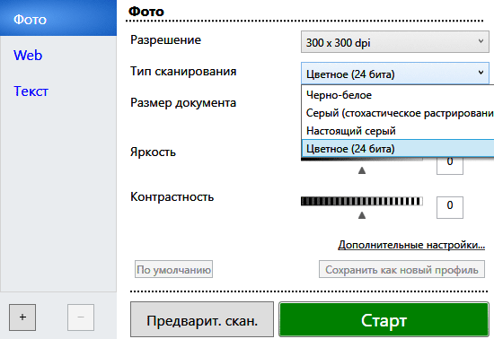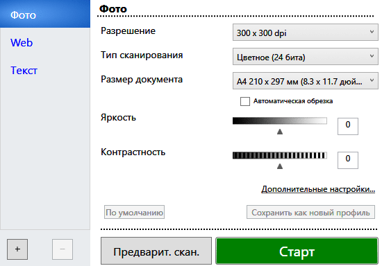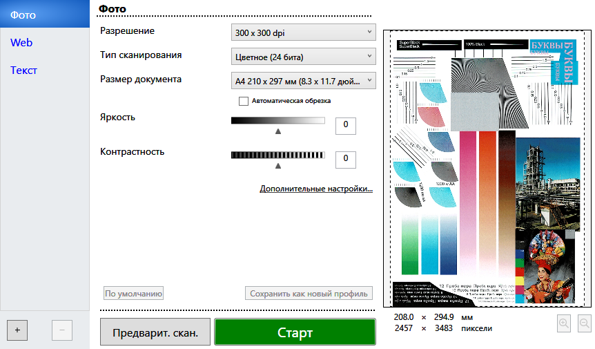 | С панели управления МФУ, передача изображения в приложение | 100×100 dpi, черно-белое | 11 |