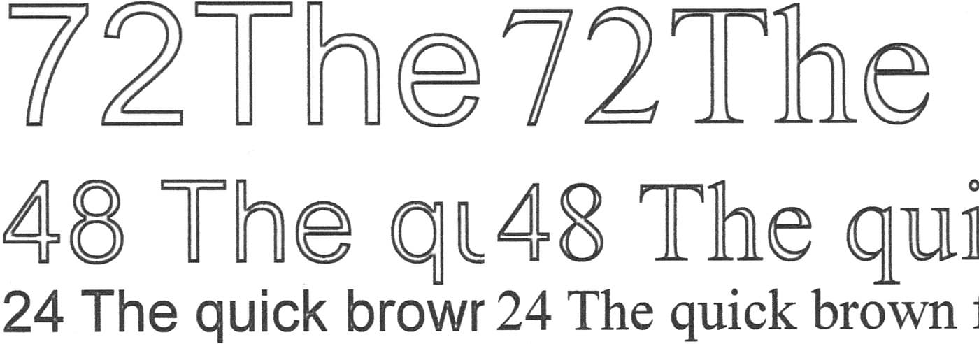 При перечисленных выше вариантах установок получаем почти одинаковые результаты: довольно уверенная читаемость начинается с 4-го кегля для шрифтов обоих типов. Если смотреть невооруженным глазом, то контуры букв достаточно четкие, но при сильном увеличении становятся заметны неровности по краям символов — даже хорошая офисная бумага имеет поры, по которым происходит растекание чернил (это, кстати, мешает восприятию самого мелкого 2-го кегля без засечек). Отпечатки можно назвать немного бледными, то есть заливка недостаточно плотная, но это можно попытаться скорректировать имеющимися в драйвере настройками.