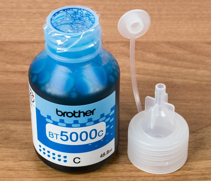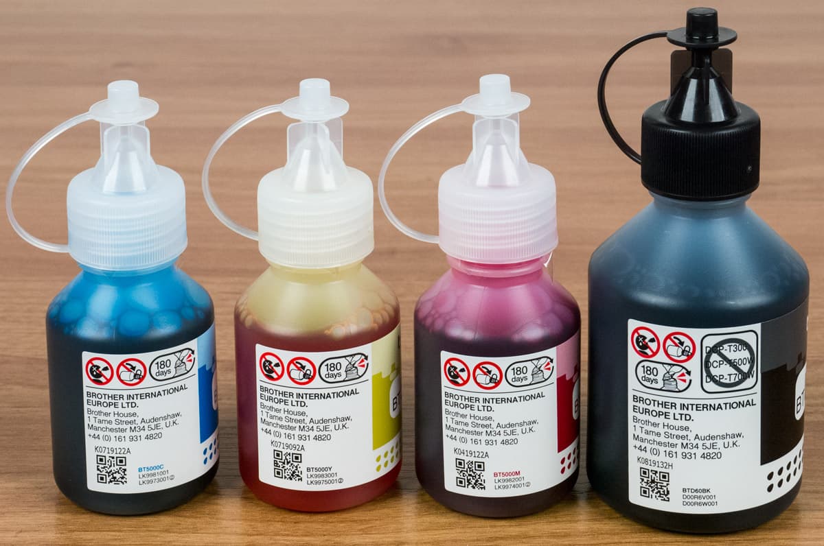 - по одной емкости с цветными чернилами Cyan, Magenta, Yellow по 48,8 мл (до 5 тысяч отпечатков А4), они маркируются BT5000 с добавлением первой буквы цвета,