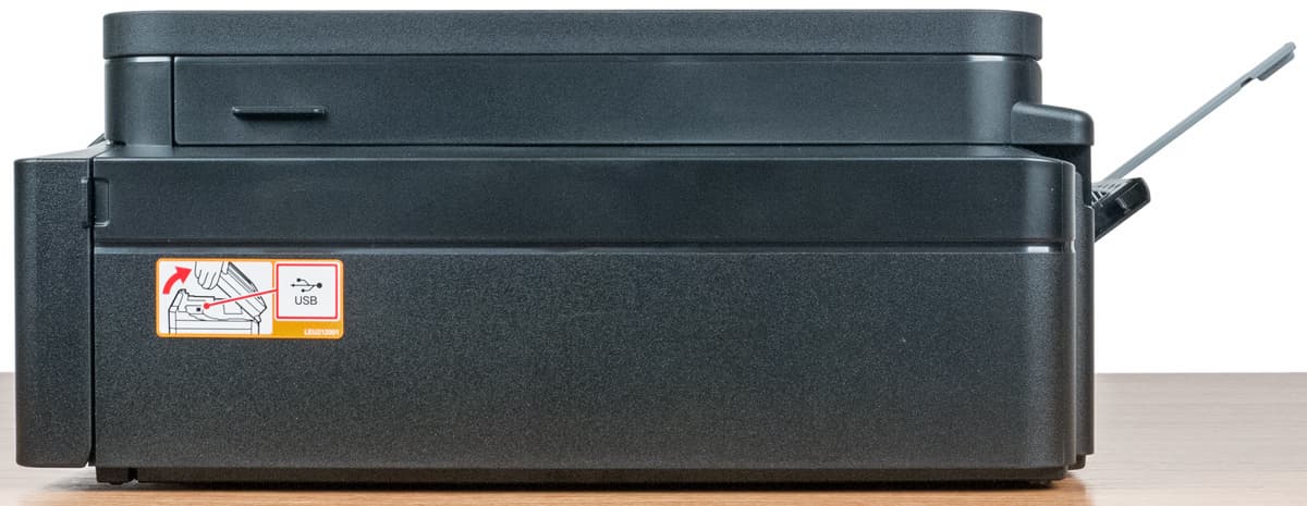Порт USB-B расположен крайне необычно: внутри аппарата! Доступ к нему получаем при откинутом блоке сканера.