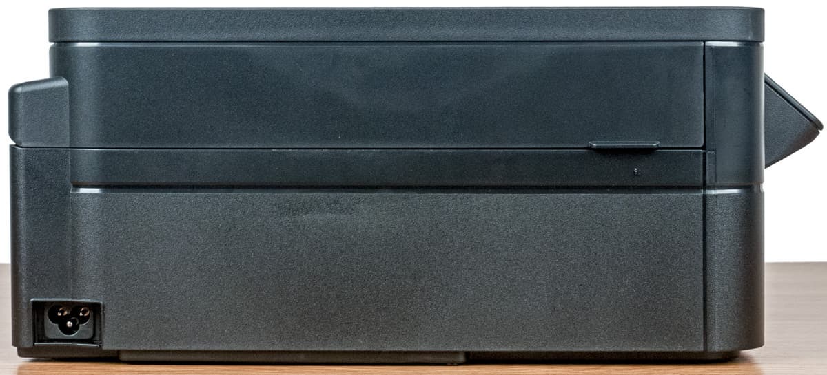 Разъем питания находится на левом боку, ближе к задней стенке. Для подключаемого к нему кабеля слева потребуется 6-7 сантиметров свободного места, и лучше бы разработчикам расположить это гнездо сзади — все равно за аппаратом надо оставить немало места для работы со слотом ручной подачи.