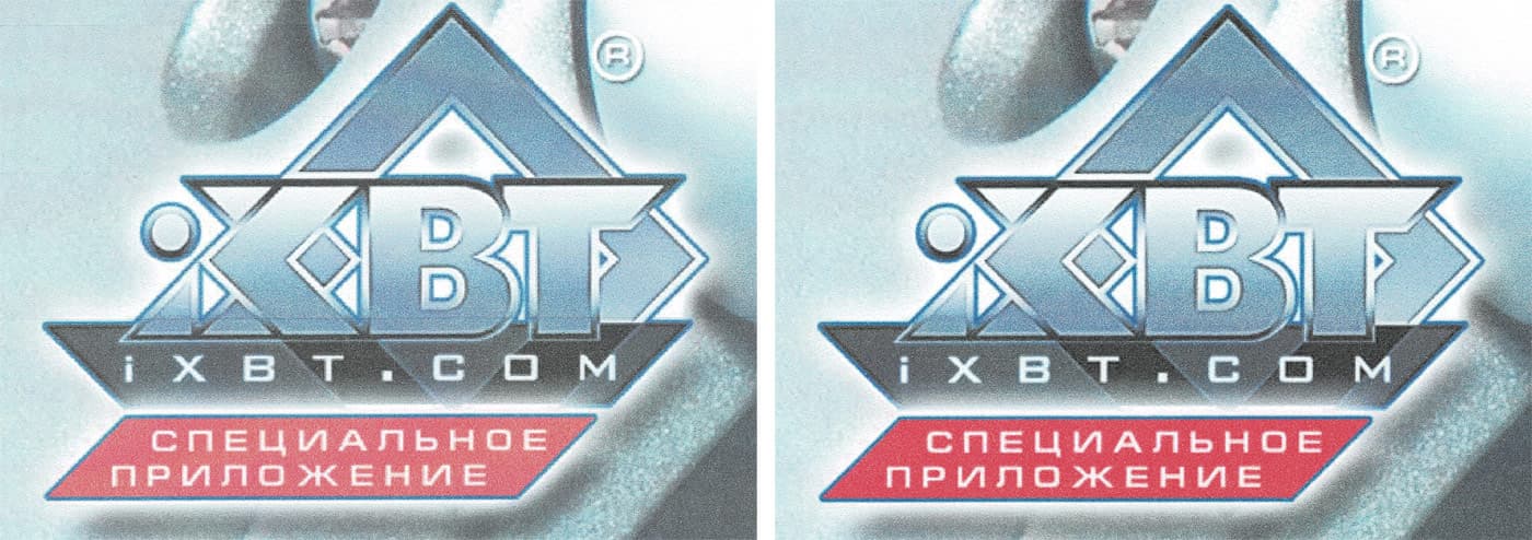 Сделанные с разными установками качества отпечатки отличить очень трудно, даже когда речь идет о сравнении «высокого» с «быстрым» (правда, в последнем случае могут появляться слабо различимые тонкие полосы поперек движения листа — одна такая видна в нижней части букв iXBT слева на приведенной ниже иллюстрации).