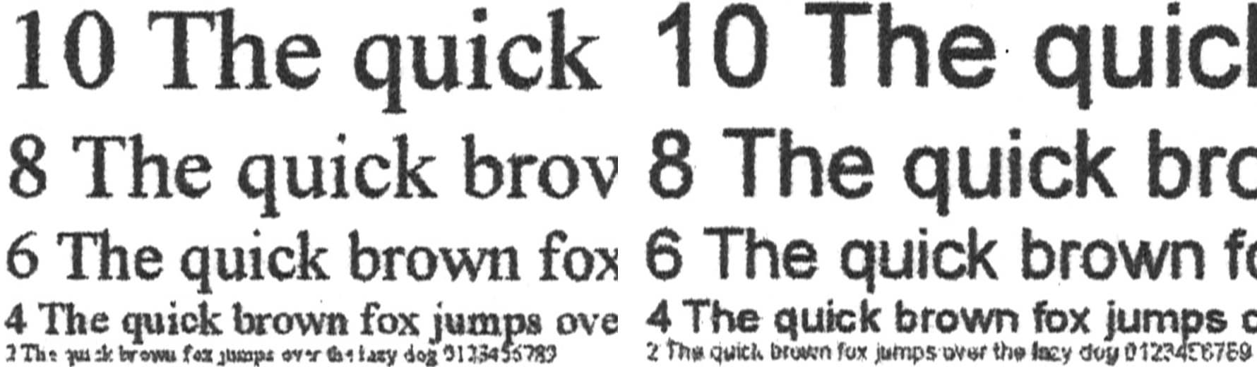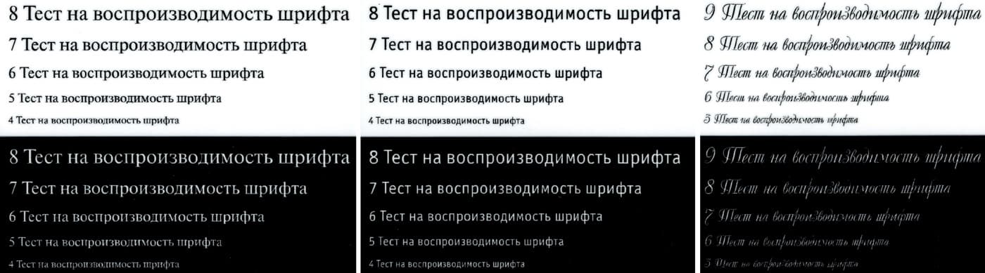 Текстовые поля воспроизводятся очень хорошо: при печати нормальной и вывороткой шрифты с засечками и без читаются от 4-го кегля. Даже декоративный шрифт, который обычно передается существенно хуже, реально читается с кеглем от 5-го нормальный и от 6-го вывороткой.