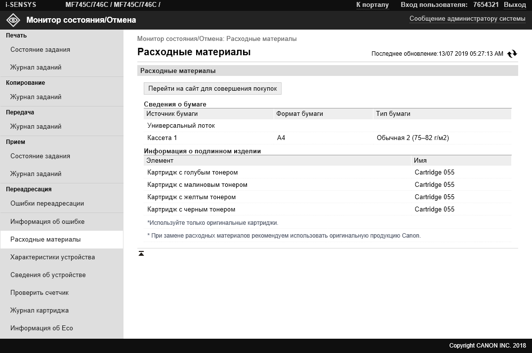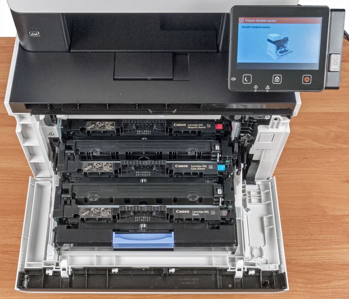 Расходными материалами являются картриджи. Хотя в инструкции они именуются «картриджами с тонером», но отдельных drum-картриджей в устройствах данной серии нет, используемые картриджи содержат еще и фотобарабаны. Таким образом, замена расходных сводится к очень простой операции, да и номенклатура для закупки сводится всего к четырем позициям, хотя, возможно, это и не самый лучший вариант с точки зрения себестоимости отпечатка.