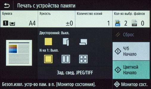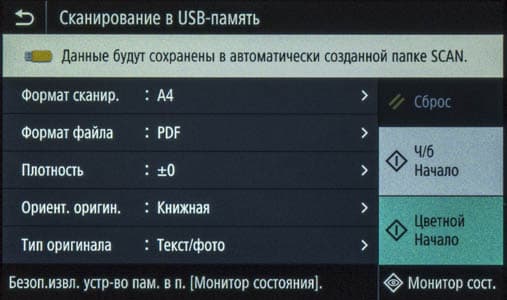 Для работы с USB-флешки задавалось сохранение в виде многостраничного PDF-файла (размер: стандартный), время замерялось от нажатия кнопки «Пуск» до появления сообщения об окончании записи файла, при сканировании с компьютера (драйвер ScanGear) — от старта кнопкой приложения до появления последней страницы в его окне.