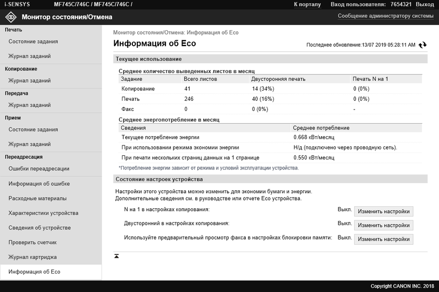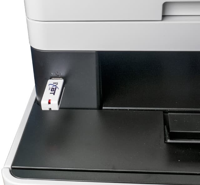 Под хорошим оснащением подразумевается следующее: помимо ставшего уже стандартом дуплекса (устройства автоматической двусторонней печати), аппарат имеет три интерфейса — локальный USB и два сетевых, проводной и беспроводной, а также порт для подключения USB-носителей, с которых можно печатать и на которые можно сохранять сканы в автономном режиме. Мобильные устройства могут взаимодействовать с МФУ еще и в режиме прямого подключения Wi-Fi или с использованием NFC.