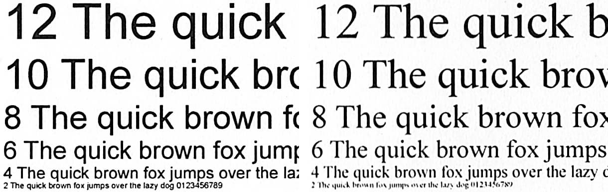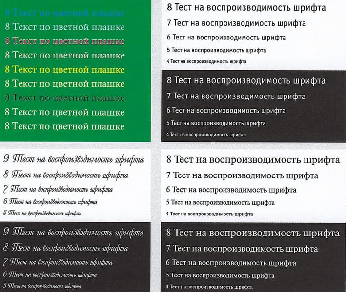 На текстовых полях при печати нормальной и вывороткой шрифты с засечками и без читаются от 4-го кегля, декоративный шрифт реально читается с кеглем от 6-го нормальный и от 7-го вывороткой. И даже цветной текст на зеленой плашке выглядит неплохо, исключая лишь синий шрифт.