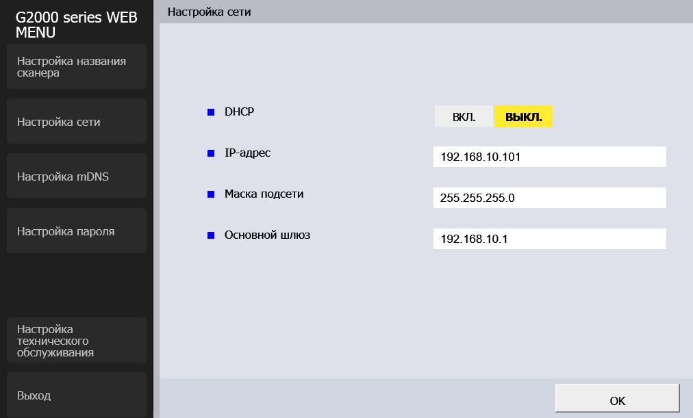 Параметры сети можно задавать с помощью панели управления сканера, вручную или с использованием DHCP.