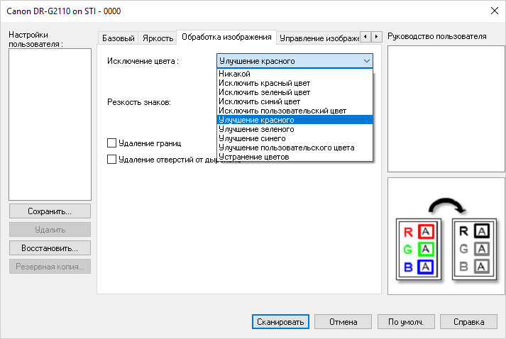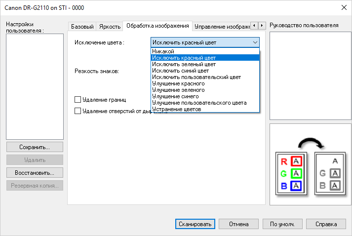 Можно задействовать предотвращение просвечивания (что может быть актуально для двусторонних оригиналов) и удаление фона, а также исключить и усилить в отсканированном изображении цвета (красный, синий, зеленый или промежуточные).