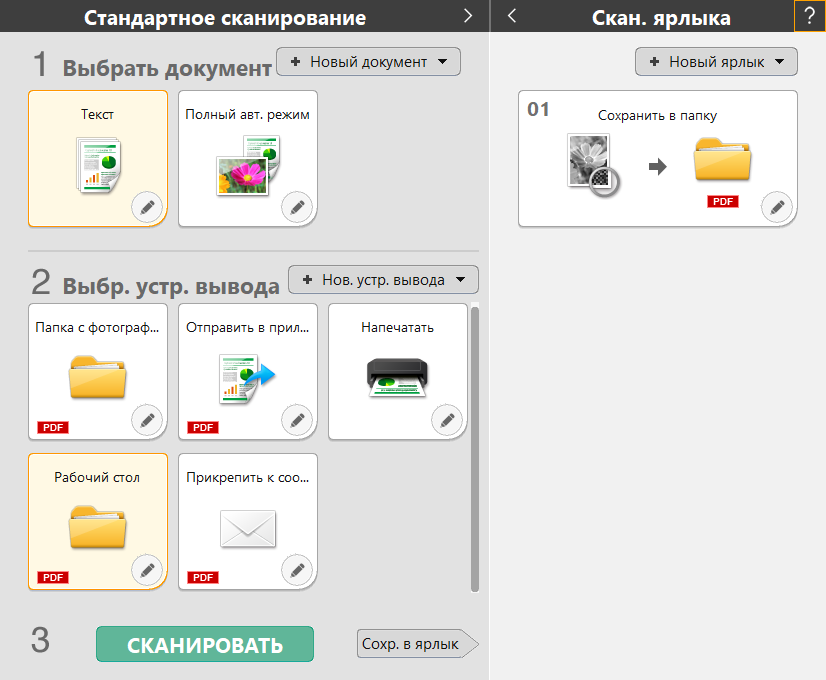 В интерфейсе программы предусмотрены настраиваемые ярлыки для часто выполняемых задач, причем управлять процессом можно и с помощью кнопок на панели сканера.