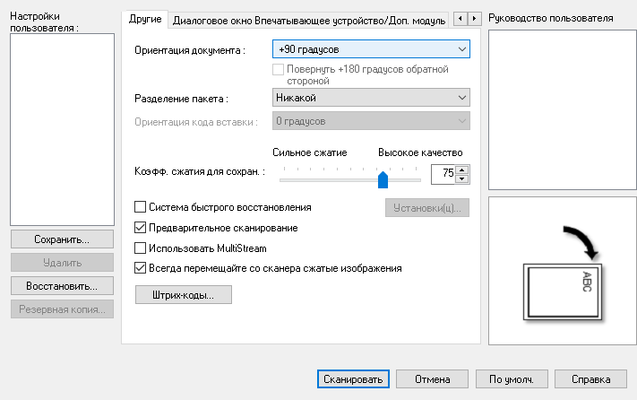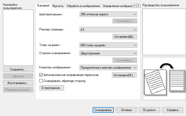 Можно задействовать автоматический поворот изображения, а также использовать предварительное сканирование (при этом обрабатывается первый лист из подающего лотка) и потом оперативно отрегулировать яркость-контрастность.