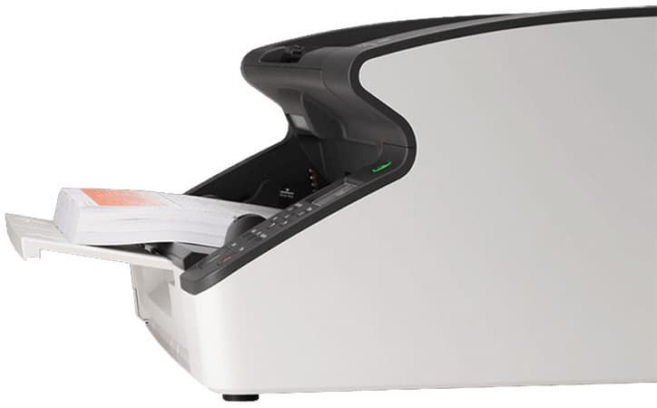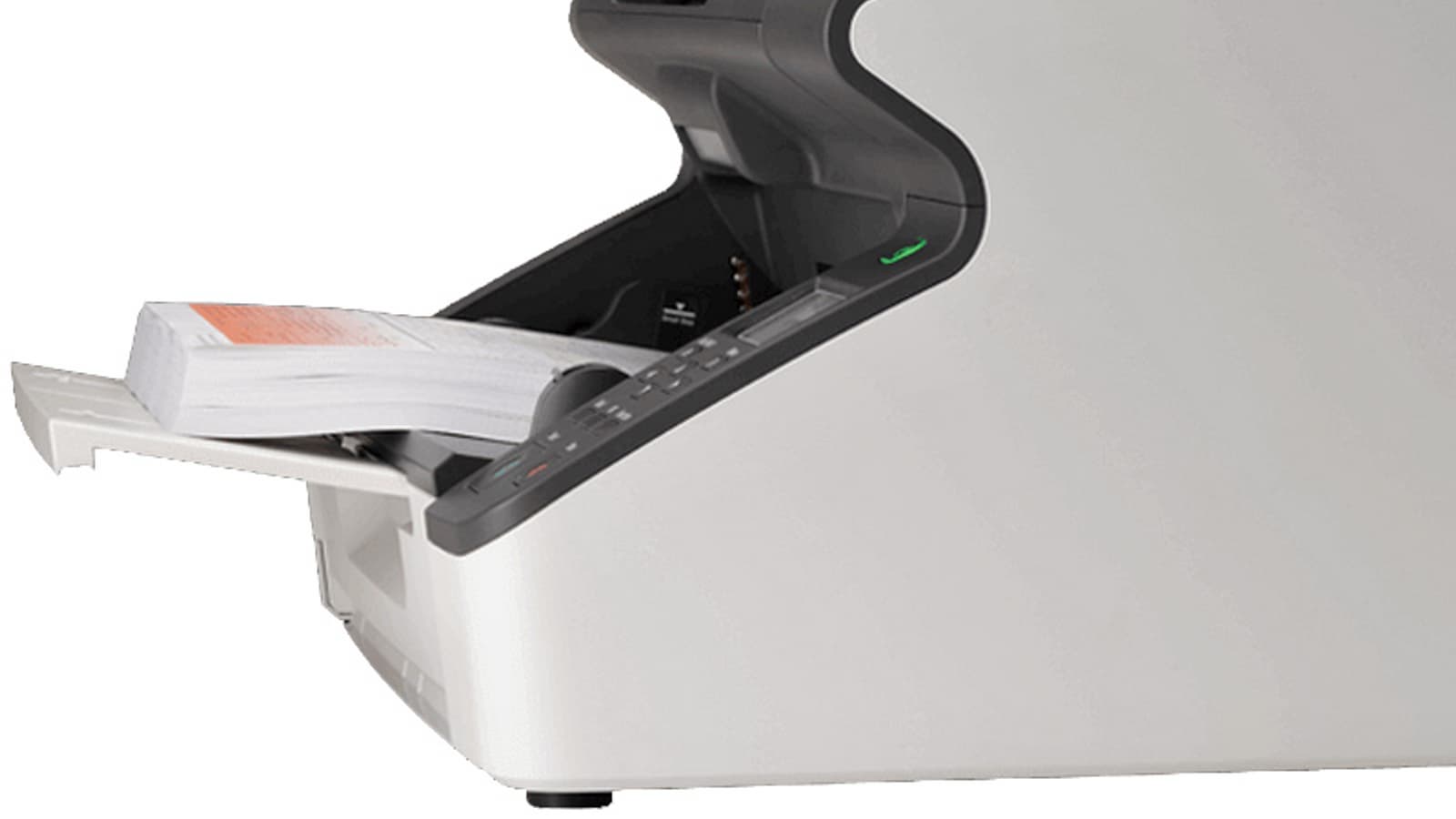 Перед началом сканирования подающий лоток поднимается вверх, прижимая стопку документов к роликам. Начальное положение лотка по высоте можно регулировать из меню в соответствии с толщиной стопки, что позволит немного сократить общее время обработки.