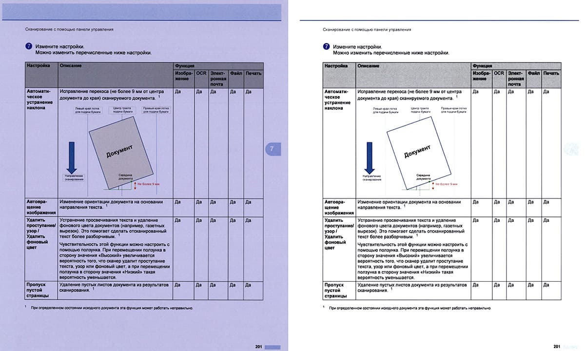 Во время сканирования определяется ориентация текста на каждой странице, при необходимости изображение поворачивается с шагом 90 градусов до достижения правильной ориентации. Имеется и функция устранения перекосов.