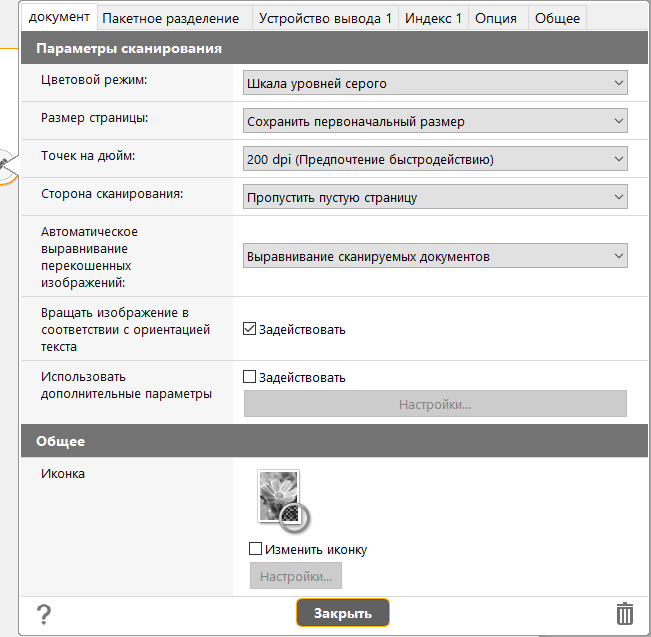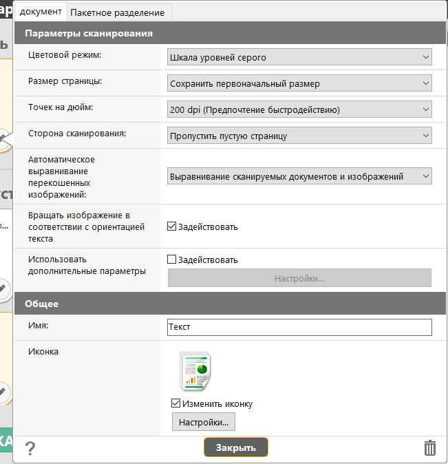 Предусмотрены функции удаления теней от отверстий для скоросшивателя в оригинале, пропуска пустых страниц, корректировки толщины текста и линий, сглаживания фона, обнаружения штрих-кодов.