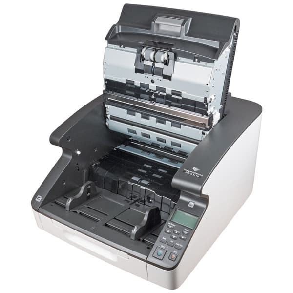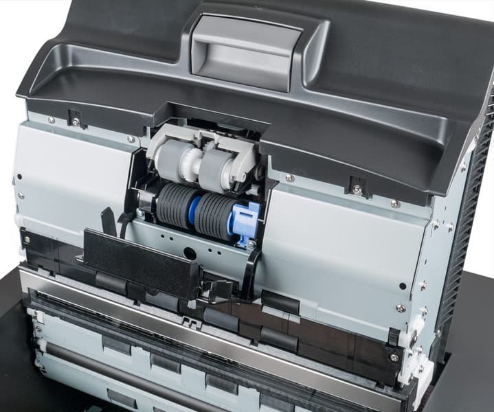 Верхняя часть сканера вместе с приемным лотком откидывается вверх, открывая доступ к частям и механизмам для устранения застрявших листов и обслуживания, в том числе для замены роликов.