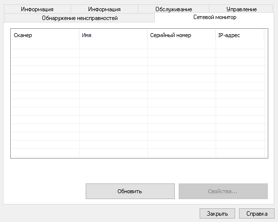 Единственная доступная кнопка «Обновить» никакого эффекта не давала — сканер в сети не обнаруживался.