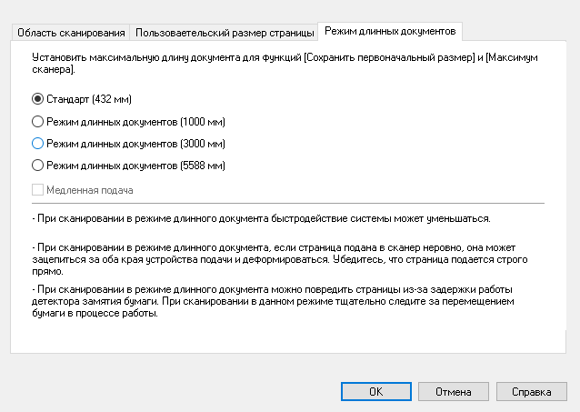 Длинные оригиналы: у нас нашелся отпечаток на фотобумаге шириной 21 см и длиной 1 метр. Соответственно в драйвере мы включили «Режим длинных документов (1000 мм)» и задали сканирование в цвете с разрешением 400 dpi и приоритетом скорости. Кроме того, размер страницы установили как пользовательский формат 21×1000 см.