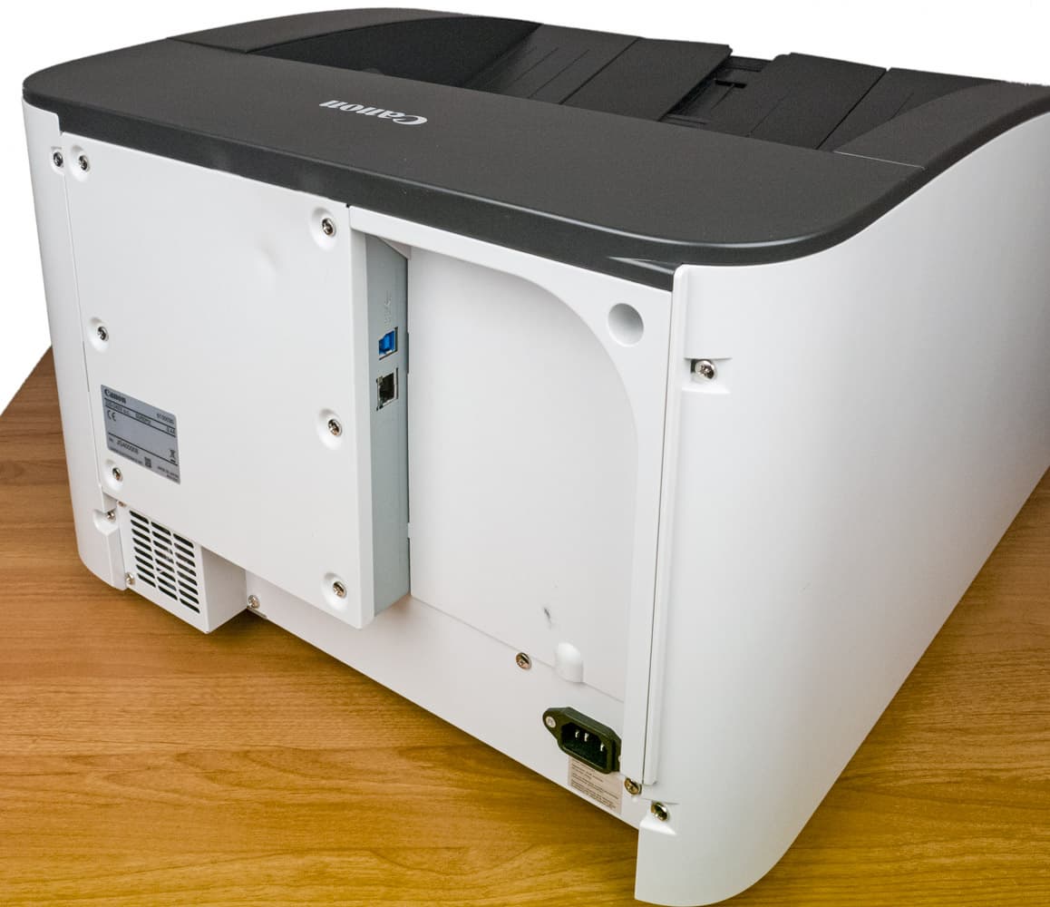 На задней стенке аппарата имеются розетка для кабеля питания, вентиляционная решетка и ниша, в боковой поверхности которой находятся интерфейсные разъемы — USB 3 type B и гнездо 8P8C (RJ45) для LAN.