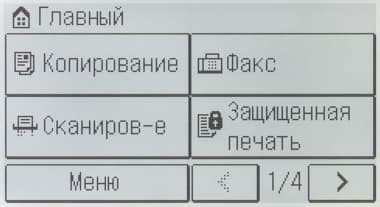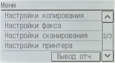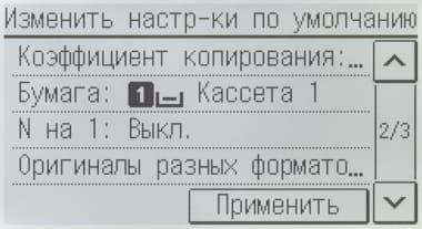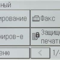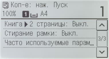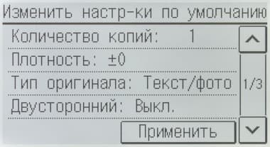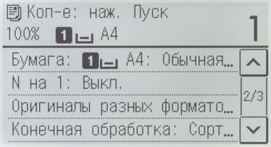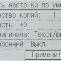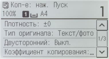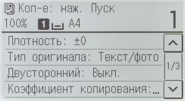 Экран копирования имеет три страницы с настройками. Их набор обычный, он включает изменение плотности и масштаба (данная строчка не очень удачно названа «Коэффициент копирования»), определение типа оригинала (текст, фото и текст/фото) и количества сторон на оригинале и копии, оперативный выбор лотка для подачи бумаги (а вот это бывает не во всех МФУ), размещение до 4 страниц оригиналов на одном листе копии (с соответствующим уменьшением) и т. п.