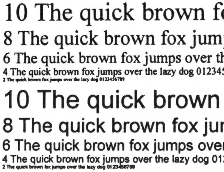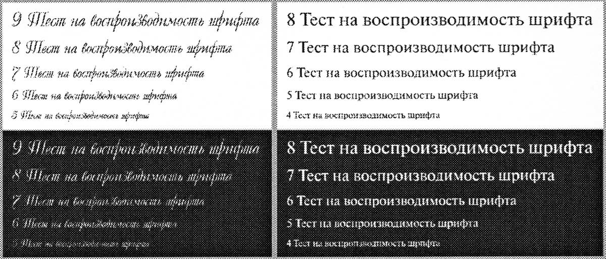 При печати передачу текстовых образцов выдающейся не назовешь: уверенная разборчивость начинается с 6-го кегля для шрифтов обоих видов; для шрифтов без засечек условно читаемым можно назвать 4-й кегль, с засечками он практически не читается.