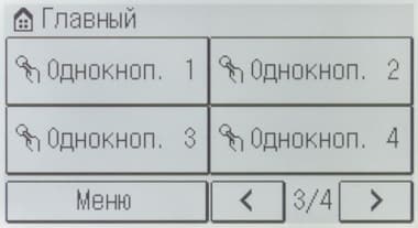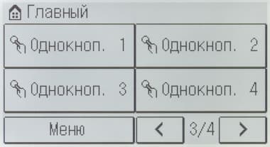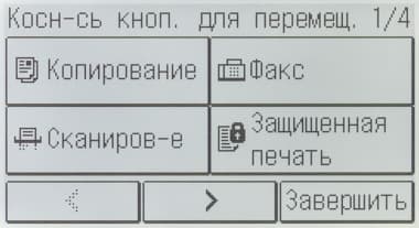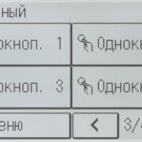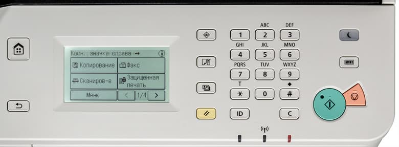 Слева от экрана две навигационные кнопки: «Домой» (переход к главной странице меню) и «Возврат» (к предыдущей странице). Справа кнопок больше: упоминавшийся выше буквенно-цифровой блок, отдельные кнопки для выбора источника бумаги и регистрации ее типа/формата, вывода сведений о состоянии, копирования ИД-карт и сброса настроек. Ближе к правому краю находятся более крупные и выделенные цветом кнопки «Пуск» и «Стоп», подсвечиваемая клавиша управления режимом энергосбережения, а также кнопка проверки счетчика.